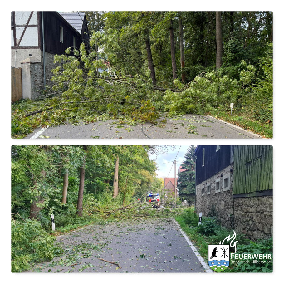 Nach einen Baumsturz war die Durchfahrt auf der Ortsstraße in Oberbobritzsch nicht mehr möglich. Die Einsatzkräfte sperrten die Unfallstelle und beseitigten das Hindernis mit einer Motorkettensäge.